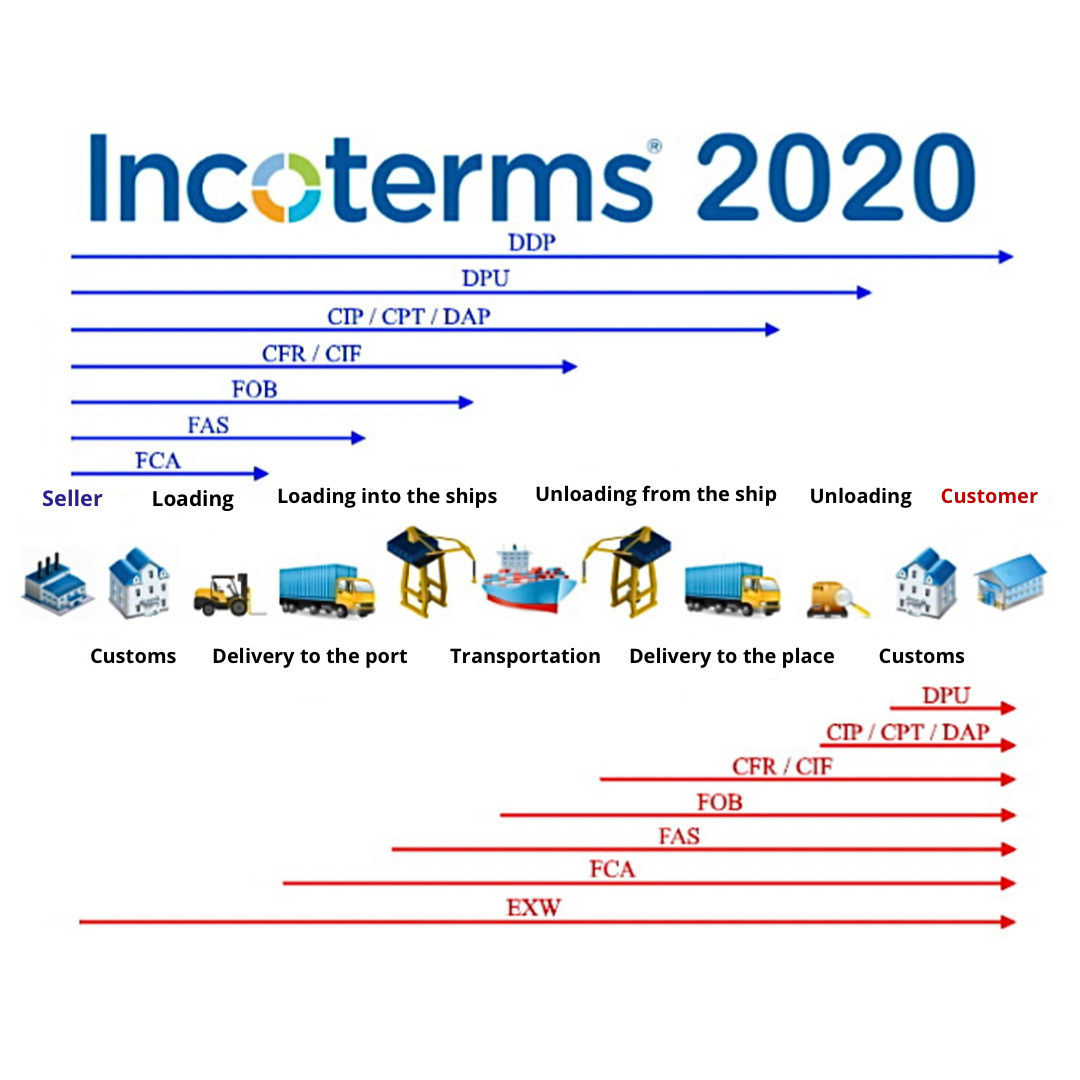 Incoterms are international rules recognized by government customs authorities, law firms, and entrepreneurs around the world as basic conditions for international trade in goods. The scope of Incoterms extends to the rights and obligations of the parties under the contract of sale in terms of transportation of goods from the seller to the buyer, liability for loss and damage to goods, customs clearance, and insurance.
